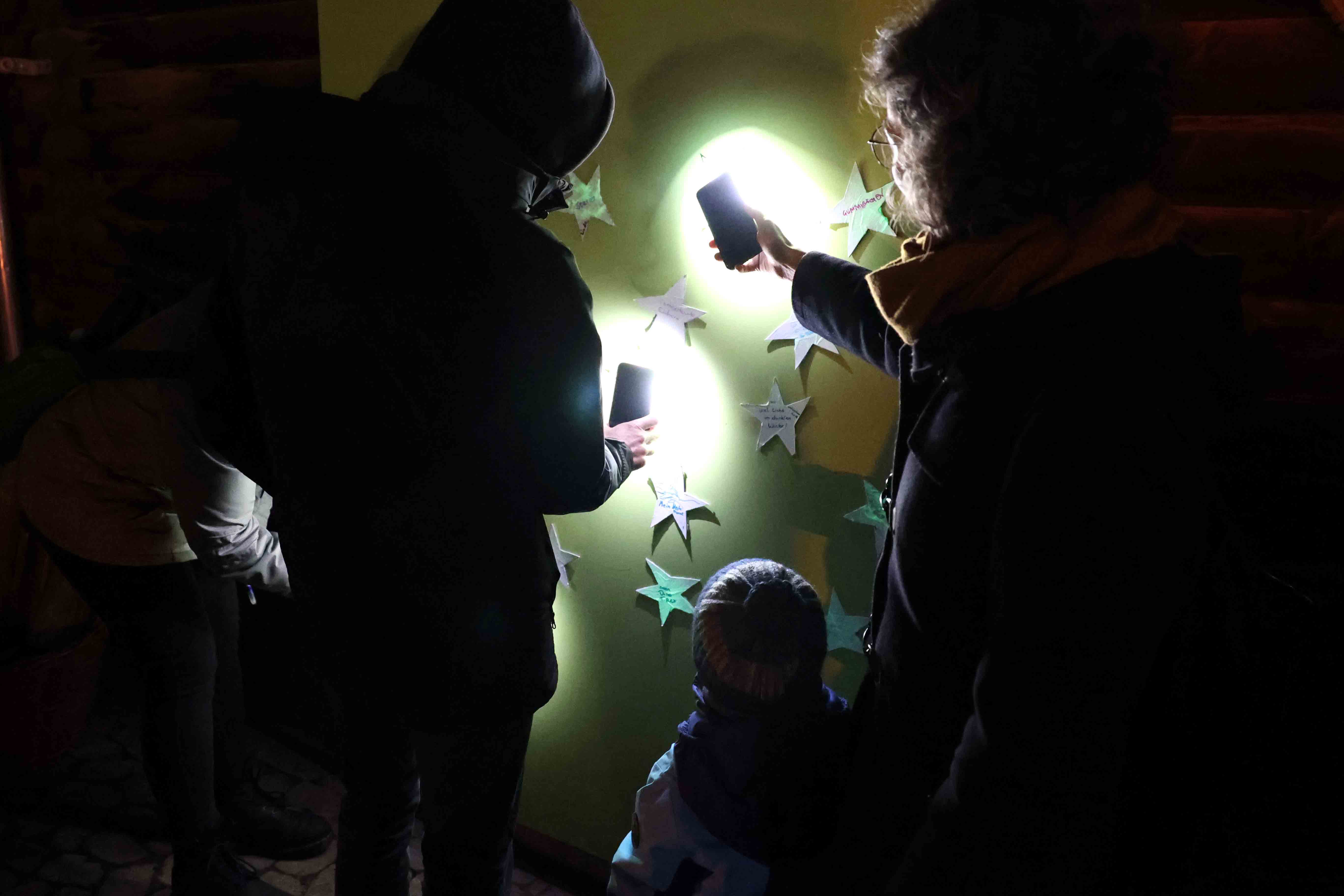 Die Leuchtsterne haben wir an die Tür geklebt - hier konnten sie gelesen werden und haben im Dunkeln geleuchtet.